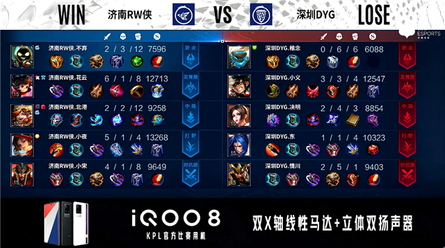 双方常规开局。1分16秒济南RW侠发育路击杀盾山拿到一血。1分53秒济南RW侠对抗路击杀关羽。2分10秒济南RW侠拿下主宰。2分18秒深圳DYG拿下暴君。5分25秒双方暴君处1换1。8分07秒济南RW侠中路击杀蒙犽。6分53秒发育路济南RW侠打出2换3。7分30秒济南RW侠拿下暴君。8分20秒发育路团战济南RW侠打出1换3。8分38秒济南RW侠摧毁敌方发育路高地塔。8分58秒深圳DYG中路击杀沈梦溪。9分20秒济南RW侠野区击杀盾山。9分47秒济南RW侠对抗路单杀不知火舞。11分23秒济南RW侠摧毁敌方中路高地塔。12分29秒对抗路团战双方1换1。14分33秒济南RW侠对抗路击杀关羽。15分02秒深圳DYG拿下暗影主宰。15分14秒济南RW侠拿下暗影暴君。15分48秒中路团战济南RW侠打出0换3。16分20秒济南RW侠团灭对手摧毁水晶拿下比赛。