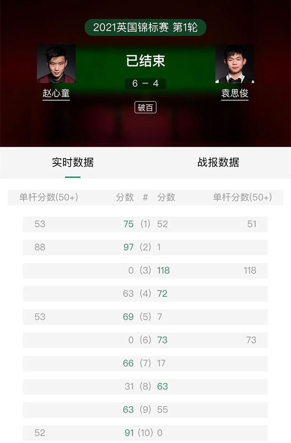 赵心童与袁思俊进行内战,赵心童再次打出来不错水平。首局单杆53分逆转拿下,第二局一杆88分以97:1拿下此局取得2-0领先再下一局。此后袁思俊连追两局,其中第三局单杆118分。第四局,袁思俊72:63赢下此局2-2战平赵心童。第五局赵心童一杆53分再胜,69:7拿下此局以3-2继续领先袁思俊。第六局袁思俊单杆73分又追至3-3。此后两人各下一局,赵心童在4-4后连赢两局,第十局以一杆52分91:0零封袁思俊成功晋级。锁定胜局,总比分6-4过关。