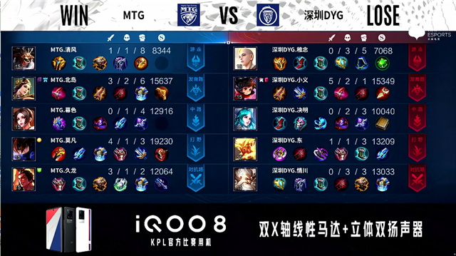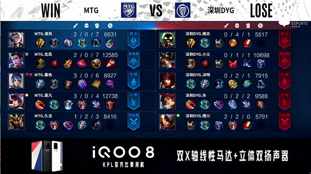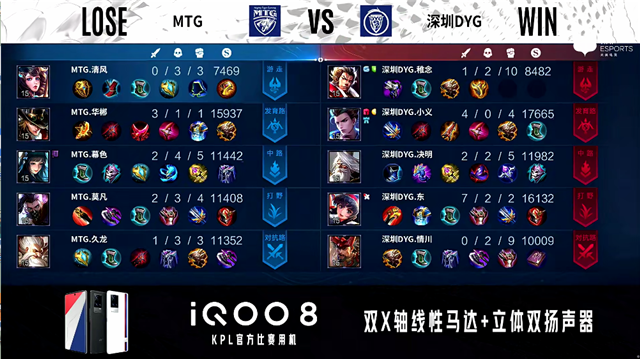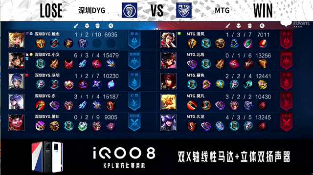 1分56秒,MTG马超配合盘古击杀猪八戒拿下一血。2分09秒,深圳DYG控下暴君。2分40秒,深圳DYG镜击杀张飞。4分50秒,MTG张飞下路击杀蒙犽,随后破掉深圳DYG下一塔。6分18秒,MTG控下暴君。6分45秒,深圳DYG下路越塔击杀李元芳。7分15秒,深圳DYG孙膑中路击杀周瑜。7分54秒,深圳DYG镜配合队友入侵野区击杀盘古。8分24秒,深圳DYG下路击杀马超,随后破掉MTG下二塔。9分26秒,深圳DYG接连破掉MTG上路两座外塔。9分54秒,深圳DYG蒙犽中路击杀张飞。10分15秒,MTG控下暗影主宰,随后深圳DYG控下暗影暴君。12分10秒,MTG破掉深圳DYG中一塔。13分03秒,中路团,MTG打出1换2,随后破掉深圳DYG中二塔。14分10秒,深圳DYG击杀张飞,随后击杀周瑜。14分46秒,深圳DYG控下暗影暴君,随后破掉MTG中一塔。15分05秒,深圳DYG下路击杀马超,随后MTG控下暗影主宰。17分45秒,深圳DYG击杀盘古,随后破掉MTG中二塔。18分08秒,深圳DYG破掉MTG下高地。19分05秒,双方团,MTG马超绕后助队伍打出0换5团灭对手。19分37秒,MTG中路一波摧毁深圳DYG水晶,让二追三赢下比赛!