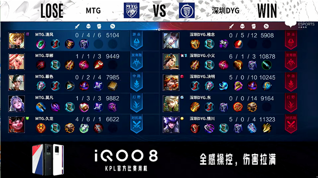2分15秒,MTG西施击杀廉颇拿下一血。2分25秒,深圳DYG控下暴君,随后MTG控下先知主宰。3分55秒,MTG西施击杀姜子牙。5分48秒,深圳DYG击杀大乔。6分18秒,MTG打出0换2,随后控下暴君。6分49秒,MTG破掉深圳DYG下一塔。7分37秒,深圳DYG控下先知主宰。8分15秒,双方团战1换1。9分27秒,深圳DYG姜子牙击杀西施。10分12秒,深圳DYG控下暗影主宰,随后MTG控下暗影暴君。10分40秒,MTG击杀娜可露露。12分03秒,深圳DYG破掉MTG中一塔。14分23秒,深圳DYG控下暗影主宰。14分40秒,深圳DYG偷掉MTG下高地。15分56秒,深圳DYG击杀老夫子并破掉MTG上二塔。15分37秒,深圳DYG击杀大乔。16分25秒,深圳DYG团战打出0换2,随后破掉MTG上高地。16分48秒,深圳DYG击杀兰陵王。17分08秒,深圳DYG破掉MTG中二塔。17分22秒,深圳DYG控下暗影暴君。18分48秒,深圳DYG控下暗影主宰。20分29秒,双方团,深圳DYG打出2换5。20分55秒,深圳DYG中路一波摧毁MTG水晶再下一城。