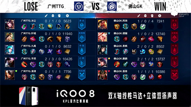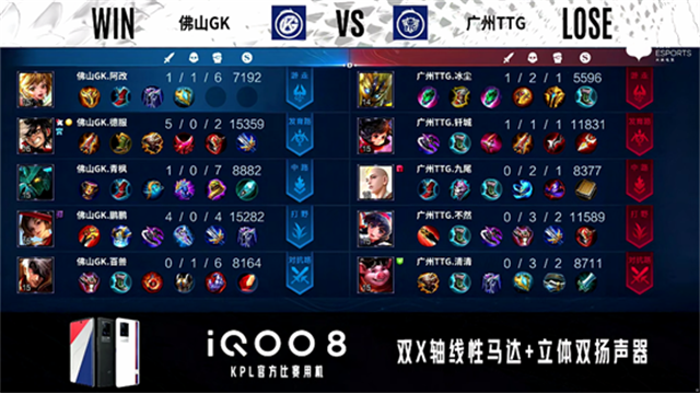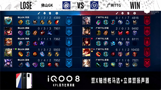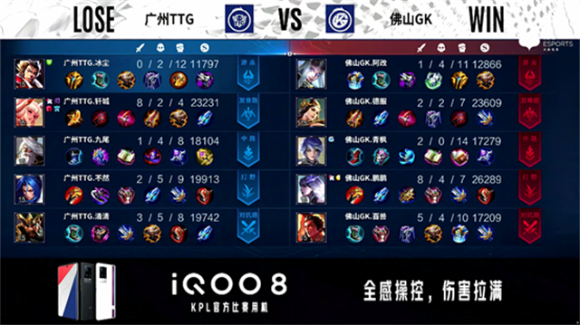 2分30秒,野区团,佛山GK打出1换2。2分58秒,佛山GK控下暴君。4分18秒,佛山GK击杀鬼谷子。4分52秒,广州TTG控下先知主宰。5分47秒,佛山GK上路击杀鬼谷子。6分06秒,佛山GK破掉广州TTG中一塔。6分29秒,广州TTG破掉佛山GK上一塔,佛山GK破掉广州TTG下一塔。6分57秒,佛山GK团战打出0换2。7分21秒,佛山GK破掉广州TTG中二塔。7分34秒,佛山GK控下暴君。9分23秒,佛山GK控下先知主宰。9分44秒,佛山GK下路击杀娜可露露。10分52秒,佛山GK控下暗影暴君。13分05秒,佛山GK控下暗影主宰。14分06秒,佛山GK破掉广州TTG上高地,随后破掉广州TTG中高地。14分42秒,广州TTG击杀夏侯惇。15分25秒,佛山GK击杀娜可露露,15分55秒,佛山GK控下暗影暴君。16分18秒,佛山GK破掉广州TTG下高地。17分01秒,佛山GK下路击杀断线的娜可露露。17分25秒,佛山GK上路击杀李元芳。17分58秒,兵线到达后佛山GK摧毁广州TTG水晶赢下比赛。
