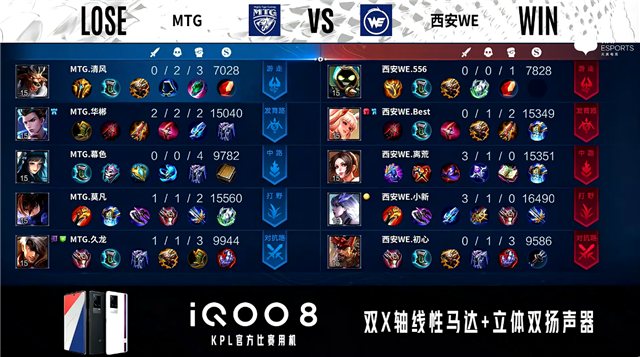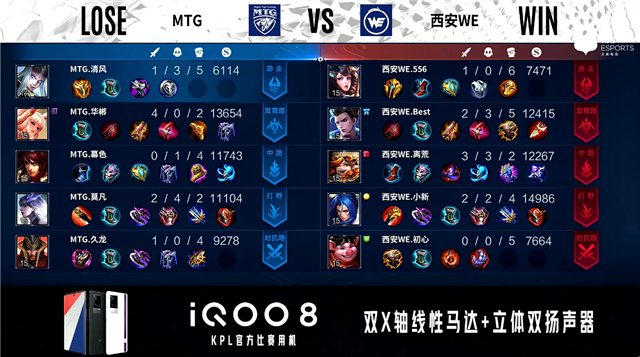 双方常规开局。2分17秒西安WE拿下主宰,MTG拿下暴君。2分34秒MTG发育路打出1换2。4分15秒MTG对抗路击杀马超。4分24秒MTG发育路击杀周瑜。4分53秒暴君处团战MTG击杀阿古朵。5分54秒MTG摧毁敌方发育路二塔。8分45秒中路团战MTG打出0换2。9分30秒MTG拿下暴君。10分39秒MTG拿下暗影暴君。11分14秒MTG发育路打出1换2。12分22秒MTG野区击杀阿古朵。12分47秒对抗路双方1换1。14分14秒MTG中路击杀马超。15分26秒发育路团战MTG打出1换4。15分51秒MTG摧毁敌方水晶拿下比赛。