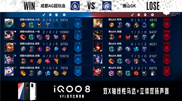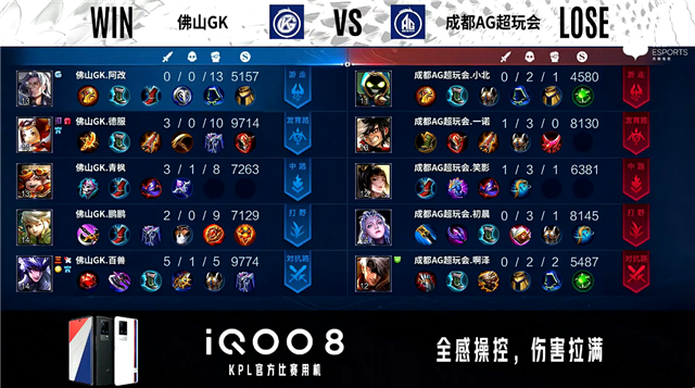 开局成都AG不知火舞走对抗路、廉颇走中路,佛山GK嬴政走发育路、公孙离走中路。2分13秒佛山GK抢到主宰。8分14秒佛山GK摧毁敌方中路外塔。10分14秒佛山GK拿下暗影暴君。11分53秒佛山GK拿下暗影主宰。13分06秒佛山GK中路击杀不知火舞拿到一血。13分17秒佛山GK摧毁敌方中路二塔。13分38秒佛山GK野区击杀大乔。14分07秒佛山GK摧毁敌方对抗路高地塔,团战双方打野互换。15分11秒成都AG拿下暗影暴君。16分14秒佛山GK拿下暗影主宰。18分06秒发育路团战成都AG打出0换2,佛山GK摧毁敌方发育路高地塔。18分53秒双方中路1换1。20分49秒佛山GK野区击杀不知火舞。21分24秒野区团战佛山GK打出0换4。21分43秒佛山GK团灭对手摧毁水晶拿下比赛。
