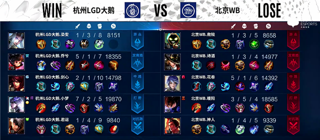 双方和平开局。2分15秒兰陵王拿下暴君,赵云拿下主宰。3分50秒下路团战,弈星拿下一血,杭州LGD大鹅打出0换2。4分10秒黄忠推掉下路一塔。6分钟黄忠推掉上路一塔。6分30秒梦奇拿下暴君,团战杭州LGD大鹅团灭北京WB。7分15秒黄忠推掉中路一塔。8分钟赵云拿下主宰。8分40秒上路团战,杭州LGD大鹅打出2换5团灭北京WB,9分11秒杭州LGD大鹅推掉水晶率先拿下赛点。