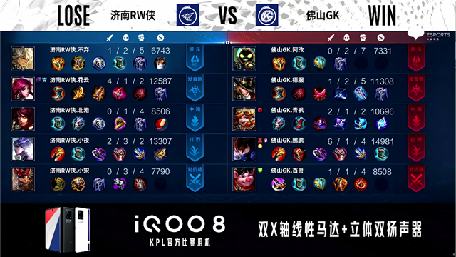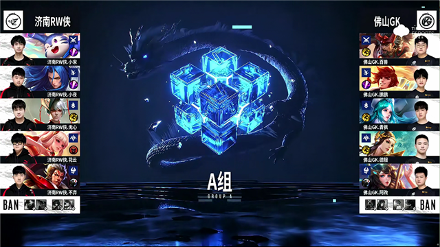 2分11秒,佛山GK控下暴君,济南RW侠控下先知主宰。5分10秒,佛山GK破掉济南RW侠上一塔。6分27秒,济南RW侠控下先知主宰,随后团战佛山GK虞姬击杀橘右京拿下一血。7分10秒,佛山GK控下暴君,随后队伍破掉济南RW侠下一塔。9分40秒,济南RW侠破掉佛山GK下二塔。10分47秒,济南RW侠控下暗影主宰,随后佛山GK控下暗影暴君。11分52秒,济南RW侠强推掉佛山GK中一塔。12分05秒,佛山GK野区击杀公孙离,随后破掉济南RW侠下二塔。13分48秒,佛山GK强破掉济南RW侠上高地。14分36秒,济南RW侠控下暗影主宰。15分53秒,济南RW侠公孙离中路反打击杀裴擒虎。16分42秒,济南RW侠破掉佛山GK中二塔。19分04秒,双方破掉对方下高地。19分31秒,济南RW侠控下暗影主宰。21分05秒,龙王团,佛山GK打出1换2。21分50秒,佛山GK控下风暴龙王,随后破掉济南RW侠中一塔。22分51秒,佛山GK破掉济南RW侠中二塔。24分钟,济南RW侠击杀王昭君,随后再击杀裴擒虎。24分50秒,济南RW侠击杀虞姬并破掉佛山GK中高地。25分08秒,济南RW侠摧毁佛山GK水晶先下一城。