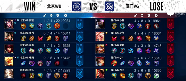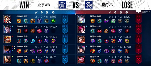 双方和平开局。2分16秒云缨拿下暴君。2分30秒河道团战,关羽拿下一血。3分45秒下路团战,双方1换1。4分钟澜拿下主宰。4分16秒双方互换边路一塔。5分24秒盾山被击杀。5分45秒云缨拿下暴君。8分30秒云缨拿下主宰。9分11秒百里守约推掉中路一塔。9分20秒中路团战,厦门VG打出0换3。12分钟云缨拿下暴君。12分30秒盾山被击杀。14分40秒野区团战,厦门VG团灭北京WB。15分13秒厦门VG推掉水晶率先拿下赛点。