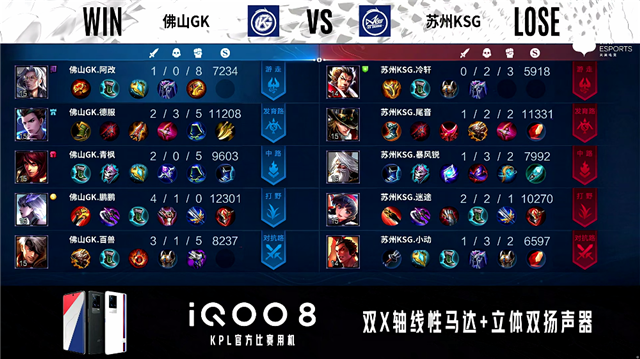 开局佛山GK反掉敌方蓝buff。2分18秒,佛山GK控下暴君。5分11秒,佛山GK狄仁杰下路1v2强行换掉姜子牙。6分20秒,上路团,佛山GK打出1换3。6分55秒,佛山GK破掉苏州KSG上二塔。7分48秒,佛山GK拿下暴君。8分51秒,佛山GK破掉苏州KSG中一塔。9分29秒,佛山GK击杀老夫子,随后破掉苏州KSG下二塔。10分47秒,佛山GK控下暗影暴君,随后秒掉老夫子。11分20秒,佛山GK破掉苏州KSG下高地。11分55秒,佛山GK控下暗影主宰。12分30秒,佛山GK击杀姜子牙,随后破掉苏州KSG中二塔。13分钟,佛山GK镜击杀张飞,随后队伍破掉苏州KSG中高地。13分26秒,佛山GK破掉苏州KSG上高地。13分51秒,双方团战1换1。14分53秒,上路团,佛山GK反打打出2换3。15分46秒,佛山GK剩余三人一波摧毁苏州KSG水晶,3:0赢下比赛!