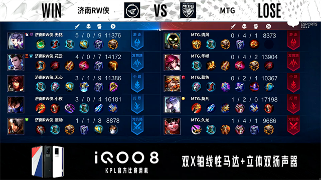 双方常规开局。1分07秒济南RW侠拿下中路河道之灵。1分18秒野区团战MTG击杀关羽拿到一血。1分30秒MTG中路击杀太乙真人。1分40秒济南RW侠中路击杀兰陵王。2分21秒暴君处团战MTG打出0换3。4分03秒济南RW侠主宰处打出1换2。4分25秒济南RW侠拿下主宰。5分31秒MTG野区击杀赵云。5分49秒主宰处团战MTG打出0换2。6分41秒中路团战双方1换1。8分42秒MTG拿下主宰。9分17秒野区团战双方2换2。10分41秒MTG拿下暗影暴君。12分04中路团战济南RW侠打出1换2。MTG摧毁敌方中路外、二塔。13分34秒MTG拿下暗影主宰。15分13秒MTG拿下暗影暴君。16分56秒济南RW侠打出2换3。18分10秒主宰处团战MTG打出1换5。18分42秒MTG摧毁敌方水晶拿下比赛。
