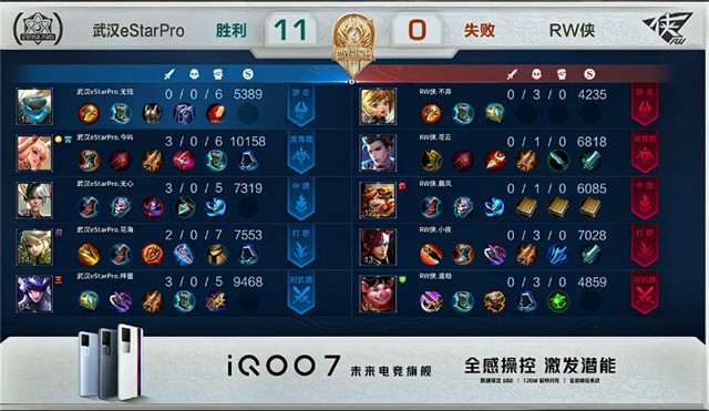 双方常规开局。55秒武汉ES入侵野区反掉红BUFF。1分53秒武汉ES关羽对抗路单杀露娜拿到一血。2分05秒武汉ES野区击杀夏侯惇。2分57秒武汉ES对抗路击杀夏侯惇。5分08秒武汉ES摧毁敌方发育路外塔。5分42秒武汉ES对抗路击杀露娜。5分59秒武汉ES中路击杀百里守约。6分27秒对抗路团战RW侠打出1换4,露娜拿到三连决胜。7分09秒双方中路1换1。8分18秒武汉ES拿下主宰。8分42秒武汉ES中路击杀张飞。9分35秒武汉ES拿下暗影暴君。10分18秒武汉ES拿下暗影主宰,RW侠拿下暗影暴君。11分03秒武汉ES摧毁敌方中路外塔。11分21秒野区团战武汉ES打出0换3。11分51秒武汉ES摧毁敌方对抗路高地塔。14分43秒RW侠抢到暗影主宰。15分10秒武汉ES中路击杀夏侯惇。15分22秒武汉ES拿下暗影暴君。15分56秒发育路双方游走互换。16分27秒RW侠对抗路击杀关羽。17分09秒RW侠摧毁敌方中路外塔。18分23秒双方高地下1换1。18分59秒RW侠拿下暗影主宰。20分28秒中路团战武汉ES打出0换3。21分05秒武汉ES摧毁敌方水晶拿下比赛。