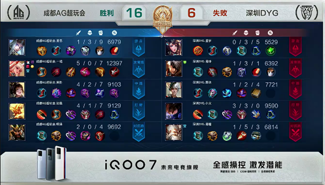 开局深圳DYG3Buff开局。1分45秒深圳DYG强攻上路一塔,镜拿下一血。2分37秒镜拿下主宰。2分48秒深圳DYG入侵野区,不知火舞被击杀。2分50秒娜可露露拿下暴君。3分20秒成都AG超玩会上路一塔被破。4分10秒深圳DYG入侵野区,双方1换1。6分03秒太乙真人被击杀。6分27秒镜拿下暴君。6分50秒李元芳推掉上路一塔。7分10秒野区团战,墨子被击杀。8分钟野区团战,成都AG超玩会打出1换2。10分10秒野区团战,李元芳被击杀。10分47秒镜拿下暴君。11分钟镜推掉下路一塔。12分16秒主宰团,娜可露露拿下主宰,太乙真人被击杀。13分11秒廉颇被击杀。13分45秒河道团战,墨子被击杀,李元芳推掉中路一塔。14分27秒李元芳推掉上路二塔。15分20秒河道团战,成都AG超玩会打出0换2。16分钟李元芳推掉下路高地塔。16分20秒娜可露露拿下暴君。17分钟娜可露露拿下主宰。19分10秒中路团战,深圳DYG打出1换2。21分46秒深圳DYG上路高地塔被破。22分20秒娜可露露拿下风暴龙王,团战成都AG超玩会打出0换1。23分03秒成都AG超玩会推掉水晶率先拿下一分。