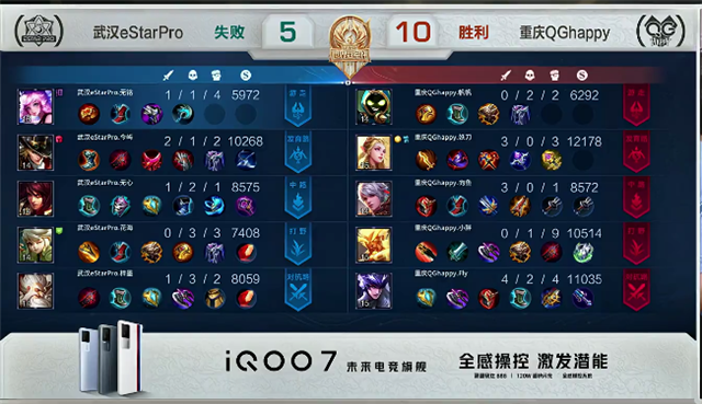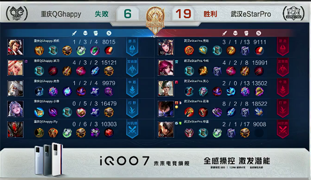 双方和平开局。2分20秒阿古朵拿下暴君。4分40秒下路团战,东皇太一拿下一血。6分钟成吉思汗推掉下路一塔。6分48秒阿古朵拿下暴君。7分18秒野区团战,重庆QGhappy打出0换3。7分40秒重庆QGhappy推掉上路二塔。8分50秒阿古朵被击杀。9分40秒上路团战,东皇太一被击杀。10分18秒镜拿下暴君。11分36秒周瑜拿下主宰。12分16秒马超被击杀。13分钟成吉思汗推掉中路一塔。14分25秒野区团战,重庆QGhappy打出0换2。15分10秒成吉思汗推掉上路高地塔。16分20秒成吉思汗拿下暴君。17分30秒阿古朵拿下主宰。18分03秒成吉思汗推掉下路高地塔。19分10秒阿古朵推掉中路高地塔。20分钟中路团战,重庆QGhappy打出2换5团灭武汉eStarPro。20分42秒重庆QGhappy推掉水晶拿下本场比赛胜利。