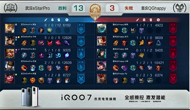 1分10秒武汉eStarPro入侵野区,沈梦溪拿下一血,双方1换1。3分10武汉eStarPro再次入侵野区,盾山被击杀。4分10秒赵云拿下主宰。4分50秒武汉eStarPro强攻下路一塔,盾山被击杀。5分钟蒙犽推掉下路一塔。7分20秒赵云拿下暴君。8分40秒赵云拿下主宰。9分06秒蒙犽推掉上路二塔。9分36秒中路团战,武汉eStarPro推掉中路一塔,团战双方1换1。10分10秒野区团战,盾山被击杀。10分47秒赵云拿下主宰。12分40秒武汉eStarPro强推上路高地塔,团战打出0换2。14分32秒赵云推掉上路高地塔。14分50秒中路团战,武汉eStarPro团灭重庆QGhappy。15分12秒武汉eStarPro推掉水晶追回一分。