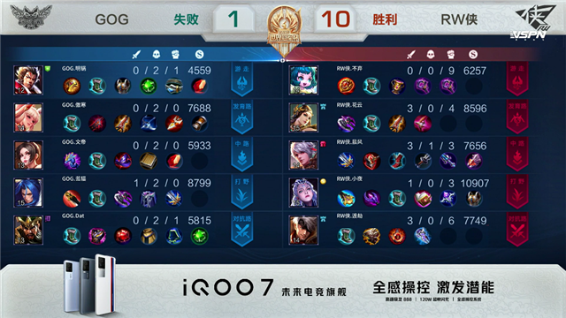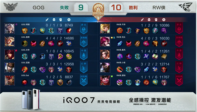 1分47秒,RW侠露娜抓上击杀关羽拿下一血。2分18秒,RW侠控下先知主宰,GOG拿下暴君。4分43秒,RW侠中路击杀不知火舞,随后破掉GOG中一塔。6分22秒,RW侠百里守约击杀公孙离。6分40秒,双方团战1换1,随后RW侠破掉GOG下二塔。8分45秒,RW侠破掉GOG上二塔,随后击杀关羽。10分08秒,RW侠击杀张飞。10分27秒,RW侠露娜控下暗影暴君,正面RW侠击杀公孙离,随后破掉GOG中高地。11分16秒,RW侠破掉GOG下高地。12分07秒,RW侠破掉GOG上高地。12分52秒,RW侠接连击杀敌方3人后,破掉GOG水晶赢下比赛!