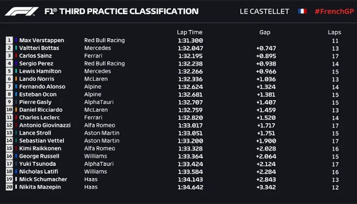 24直播网讯 北京时间6月19日,2021赛季F1第七站法国大奖赛在勒卡斯泰莱的保罗-里卡尔赛道结束第三次练习赛。
