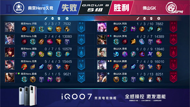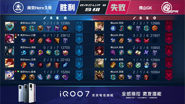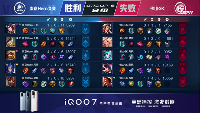 2分17秒,南京Hero裴擒虎拿下暴君。5分15秒,南京Hero拿下先知主宰。5分52秒,南京Hero破掉佛山GK上一塔。6分35秒,南京Hero控下暴君。8分03秒,佛山阿古朵配合关羽击杀裴擒虎拿下一血。8分14秒,佛山GK中路击杀西施。9分29秒,佛山GK控下先知主宰。11分29秒,南京Hero拿下暗影暴君。12分37秒,南京Hero中路击杀周瑜,随后破掉佛山GK中一塔。13分01秒,南京Hero控下暗影主宰。13分55秒,南京Hero破掉佛山GK下二塔。15分42秒,南京Hero控下暗影暴君。16分47秒,南京Hero强推掉佛山GK中二塔。17分23秒,南京Hero控下暗影主宰。18分30秒,野区团,佛山GK打出0换4。19分19秒,佛山GK强推掉南京Hero下高地。22分06秒,佛山GK击杀裴擒虎。22分48秒,佛山GK控下风暴龙王。23分35秒,佛山GK破掉南京Hero上二塔。23分50秒,佛山GK击杀裴擒虎随后破掉南京Hero中二塔。24分21秒,佛山GK先后破掉南京Hero上中、高地。24分55秒,南京Hero高地反打打出1换3。25分45秒, 南京Hero反推掉佛山GK中高地。27分50秒,南京Hero抢到风暴龙王,随后团战打出1换3。28分29秒,南京Hero击杀敌方最后两人后摧毁水晶赢下比赛!