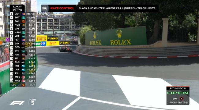 经过一番插曲后,2021F1摩纳哥大奖赛正赛顺利发车,第1圈过后,前十位发车的车手排名没有发生变化。第8圈,排在首位的维斯塔潘领先第二位的博塔斯1.289秒,塞恩斯则紧追博塔斯。第9圈,排在第六位的汉密尔顿距离维斯塔潘超过10秒。第19圈,从第1圈发车后,所有车手的顺序都没发生变化,而诺里斯由于两次违反赛道限制,被出示黑白旗。