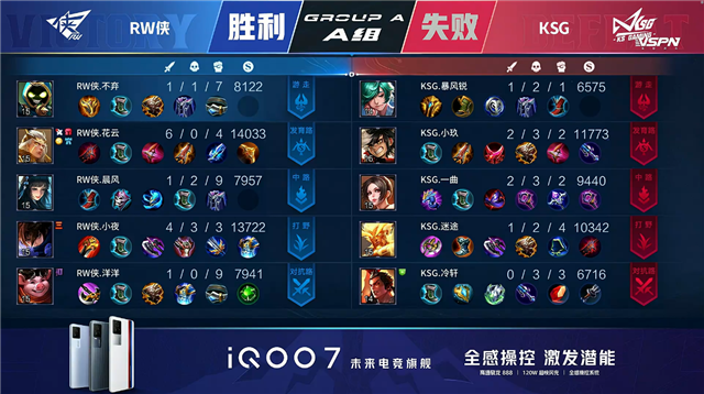 双方常规开局,1分38秒野区团战RW侠打出0换2。2分10秒KSG中路击杀嫦娥。2分34秒双方上路1换1。3分51秒RW侠下路击杀百里守约。4分30秒KSG野区击杀橘右京。5分57秒RW侠上路击杀镜。6分36秒RW侠野区击杀镜。7分13秒KSG摧毁敌方中路外塔。9分44秒RW侠拿下主宰。10分46秒RW侠上路击杀镜。11分04秒RW侠拿下暗影主宰。12分12秒RW侠野区打出0换2。12分28秒RW侠摧毁敌方上路高地塔。13分04秒RW侠拿下暗影暴君。15分35秒RW侠中路击杀墨子。15分54秒RW侠摧毁敌方中路高地塔并击杀廉颇。16分14秒双方下路1换1。17分31秒RW侠拿下暗影暴君。18分30秒RW侠野区击杀伽罗。19分24秒RW侠上路击杀镜。RW侠上路打出1换2。19分58秒RW侠摧毁敌方水晶拿下比赛。