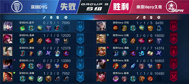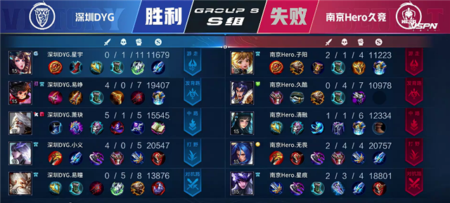 双方平稳开局。2分26秒镜拿下暴君。2分40秒中路团战,周瑜拿下一血。4分10秒裴擒虎在上路被击杀。4分20秒南京Hero久竞推掉下路一塔。4分35秒野区团战,南京Hero久竞打出0换2。5分30秒镜拿下主宰。6分40秒伽罗推掉上路一塔。7分钟镜拿下暴君。8分20秒南京Hero久竞推掉中路一塔,盾山被击杀。8分41秒南京Hero久竞推掉下路二塔。9分40秒南京Hero久竞强推上路二塔,团战南京Hero久竞打出0换2。10分25秒镜拿下暴君。11分50秒南京Hero久竞推掉中路二塔。12分钟镜拿下主宰。13分钟南京Hero久竞强推下路高地塔,团战打出1换2。南京Hero久竞顺势进攻水晶,13分39秒南京Hero久竞团灭深圳DYG推掉水晶追平比分。