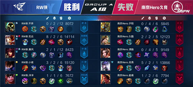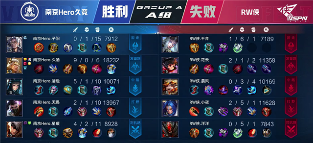 双方平稳开局。2分11秒露娜拿下暴君。2分45秒野区团战,南京Hero久竞打出0换2,关羽拿下一血。3分50秒狄仁杰被击杀。4分50秒苏烈被击杀。5分10秒RW侠下路二塔被破。5分45秒中路团战,南京Hero久竞打出0换2。6分10秒南京Hero久竞推掉中路一塔。6分30秒南京Hero久竞推掉下路二塔。6分50秒娜可露露拿下暴君。7分钟娜可露露击杀苏烈。7分24秒南京Hero久竞推掉中路二塔。8分20秒狄仁杰推掉上路二塔。8分45秒苏烈被击杀。9分25秒双方打野被击杀。10分25秒夏侯惇被击杀。10分40秒娜可露露拿下暴君。11分20秒娜可露露拿下主宰。12分20秒嫦娥单杀公孙离。12分30秒南京Hero久竞推掉中路和上路高地塔,团战中娜可露露被击杀。14分钟苏烈被击杀。14分30秒狄仁杰推掉下路高地塔,高地团战南京Hero久竞团灭RW侠,关羽拿下三杀。14分52秒南京Hero久竞攻破水晶拿下本场比赛胜利。