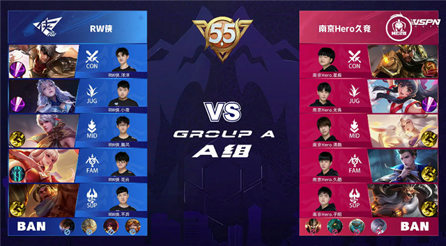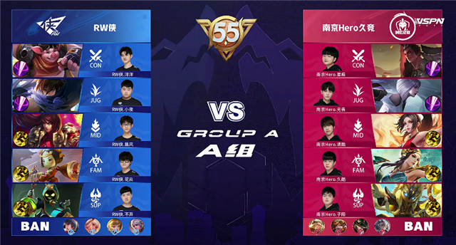 双方平稳开局。2分20秒暴君团,南京Hero久竞打出1换3,橘右京拿下一血,夏侯惇拿下双杀,RW侠拿下暴君。3分50兰陵王拿下主宰。4分10秒西施被橘右京蹲草击杀,沈梦溪越塔被击杀。4分53秒沈梦溪被击杀。5分45秒野区团战,双方1换1。6分40秒沈梦溪被击杀。6分55秒东皇太一被击杀。7分15秒橘右京推掉下路一塔。7分20秒兰陵王拿下暴君。8分40秒后羿推掉上路一塔。9分10秒东皇太一被击杀。9分20秒兰陵王单杀橘右京。10分10秒上河道团战,后羿拿下双杀。10分45秒后羿拿下主宰。11分47秒后羿推掉上路二塔。12分13秒兰陵王拿下暴君。12分40秒双方互换边路二塔。12分55秒RW侠中路一塔被破。13分钟橘右京被击杀。13分50秒白起被击杀,RW侠中路二塔被破。15分钟兰陵王拿下主宰。16分54秒后羿拿下暴君。17分20秒南京Hero久竞强攻下路高地塔,白起和橘右京被击杀。南京Hero久竞顺势转中,推掉中路高地塔强攻水晶。18分04秒南京Hero久竞推掉水晶率先拿下赛点。