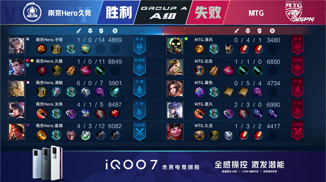 2分28秒,南京Hero不知火舞击杀马超拿下一血。3分10秒,MTG拿下暴君。5分15秒,南京Hero伽罗上路击杀马超,随后破掉MTG上一塔。5分38秒,南京Hero中路击杀牛魔。6分40秒,中路团,MTG打出1换2。8分12秒,中路团,MTG再次打出1换2,随后破掉南京Hero上二塔。8分58秒,MTG周瑜烧掉南京Hero中一塔。9分36秒,MTG破掉南京Hero下二塔。10分45秒,暴君团,MTG打出1换3。11分23秒,MTG拿下暗影暴君。12分15秒,MTG拿下暗影主宰。13分22秒,MTG破掉南京Hero中二塔。15分40秒,MTG拿下暗影暴君。16分42秒,中路团,南京Hero打出1换2。19分19秒,南京Hero拿下暗影主宰,随后团战南京Hero打出1换2。20分钟,双方团,南京Hero打出2换3。23分11秒,中路团,南京Hero打出1换5团灭对手。23分58秒,南京Hero上路平推摧毁MTG水晶3:0赢下比赛。