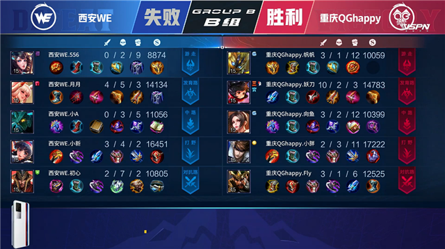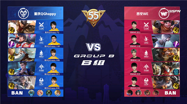 双方平稳开局。1分18秒西安WE拿下中路河道之灵。1分56秒西安WE上路击杀夏侯惇拿到一血。4分08秒重庆QG摧毁敌方下路外塔。5分20秒重庆QG上路打出0换2,娜可露露拿到二连击破。5分54秒重庆QG拿下暴君并摧毁敌方上路外塔。6分22秒下路团战西安WEE下路打出1换2。7分26秒中路团战重庆QG打出1换3。7分44秒重庆QG摧毁敌方中路外、二塔。11分05秒西安WE主宰处击杀娜可露露。11分13秒重庆QG摧毁敌方下路高地塔。14分28秒野区团战重庆QG击杀牛魔。15分整重庆QG拿下暗影主宰。16分58秒重庆QG击杀马可波罗。17分10秒重庆QG摧毁敌方中路、上路高地塔。17分30秒西安WE打出2换3,镜拿到三连决胜。19分22秒中路团战重庆QG打出0换2。19分33秒重庆QG摧毁敌方水晶拿下比赛。