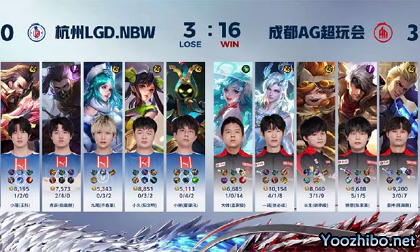 10分钟,杭州LGD.NBW尝试抓机会反扑,但成都AG超玩会凭借经济优势再次反打,成都AG超玩会零换三。12分钟,场上经济差已来到近9K,成都AG超玩会众人强势推进,LGDNBW-小久(阳文明)戈娅奋力防守,灵活走位拿下三连决胜,但壶神(陈展鹏)姬小满伤害爆炸逐个击破也收三杀,成都AG超玩会借兵线顺势破掉水晶,先下一城!