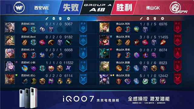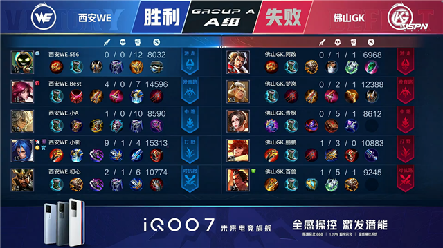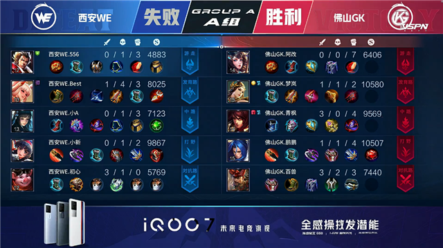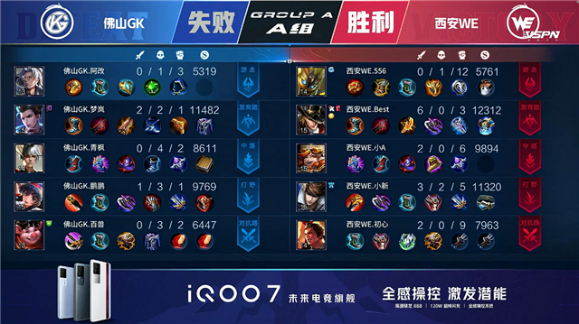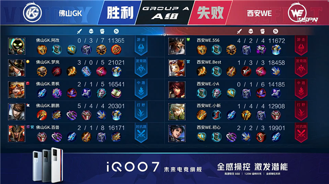 双方平稳开局,1分07秒佛山GK拿下中路河道之灵。1分18秒西安WE中路击杀太乙真人拿到一血。2分24秒双方打野分别被击杀,佛山GK拿下暴君。5分24秒佛山GK摧毁敌方上路外塔。6分23秒西安WE摧毁敌方上路外塔。6分28秒西安WE拿下主宰。7分55秒西安WE拿下暴君。8分25秒西安WE摧毁敌方上路二塔。9分52秒西安WE摧毁地方中路外塔。10分36秒西安WE拿下暗影主宰。11分18秒中路团战佛山GK打出1换3。11分57秒佛山GK拿下暗影暴君。13分24秒佛山GK摧毁敌方上路二塔。14分58秒佛山GK拿下暗影主宰。15分31秒双方野区1换1,佛山GK摧毁敌方中路外塔。16分34秒佛山GK拿下暗影暴君。17分38秒佛山GK摧毁敌方上路二塔。18分02秒佛山GK中路击杀鲁班七号。18分21秒中路团战西安WE打出1换2。19分17秒西安WE抢到暗影主宰。20分55秒中路团战西安WE打出0换2。21分31秒佛山GK沈梦溪抢到风暴龙王。26分18秒野区团战佛山GK打出1换4。27分10秒佛山GK摧毁敌方水晶拿下比赛。