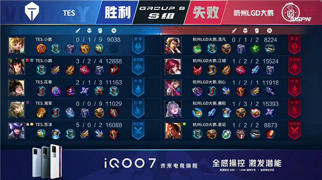 开局TES入侵敌方野区未果。1分11秒TES拿下中路河道之灵。1分29秒杭州LGD大鹅野区击杀大乔拿到一血。2分10秒杭州LGD大鹅拿下暴君。4分13秒TES拿下主宰。4分24秒杭州LGD大鹅下路击杀姜子牙。6分27秒杭州LGD大鹅拿下暴君。7分20秒双方互换边路外塔。7分53秒TES摧毁敌方上路外塔。8分26秒TES拿下暴君,中路团战TES击杀鲁班大师。8分58秒双方中路1换1。10分01秒TES上路打出0换2。10分27秒TES摧毁敌方上路二塔。10分49秒TES拿下暗影暴君。11分01秒TES摧毁敌方中路外塔。12分38秒TES拿下暗影主宰,双方团战1换1。12分48秒杭州LGD大鹅摧毁敌方中路外塔。13分22秒中路团战TES打出0换2。13分48秒TES摧毁敌方中路、上路高地塔。13分58秒TES摧毁敌方水晶拿下比赛。