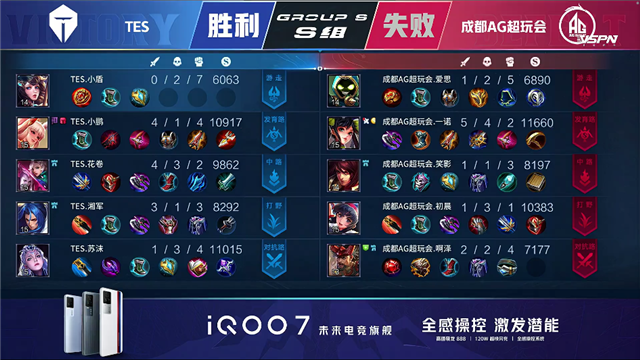 54秒成都AG廉颇击杀露娜拿下一血,双方1换1,2分20秒TES拿下第一条暴君。2分30秒下路团TES打出0换2,4分27秒成都AG拆掉TES下路一塔,4分40秒下路团TES打出1换2。5分15秒中路团双方1换1,7分07秒成都AG拿下暴君。8分05秒中路团TES拆掉成都AG中路一塔,成都AG击杀大乔,8分40秒上路团双方1换1。9分08秒成都AG下路二塔被拆,10分36秒TES拿下暗影暴君。11分10秒河道团双方1换1,13分20娜可露露、露娜互换,14分09秒成都AG廉颇被击杀。14分20秒TES拆掉成都AG下路高地打出1换2,强拆水晶拿下本局胜利。