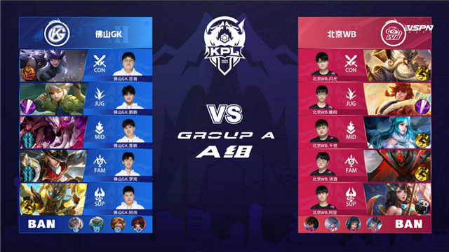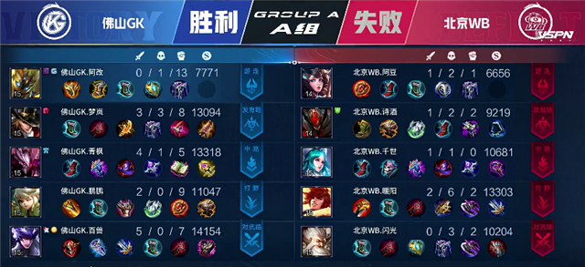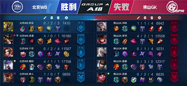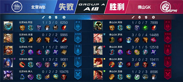 双方平稳开局。1分10秒廉颇入侵野区拿下红buff。2分25秒镜拿下暴君。3分钟廉颇入侵野区再次抢下红buff。4分10秒镜拿下主宰。4分50秒北京WB入侵野区,镜拿下一血。5分45秒北京WB强攻上路一塔,镜拿下双杀,佛山GK一塔被破。6分50秒下河道团战,佛山GK打出0换2。7分31秒佛山GK下路一塔被破。9分35秒北京WB强攻下路二塔,团战打出1换1。9分54秒北京WB推掉中一塔。11分钟镜拿下暴君。12分23秒野区团战,鬼谷子被击杀,镜拿下主宰。14分10秒北京WB推掉中路二塔。15分12秒镜拿下暴君。16分53秒镜拿下主宰。17分23秒北京WB强攻上路高地塔,不知火舞被击杀。18分15秒上河道团战北京WB打出0换3。北京WB顺势强攻高地,19分10秒北京WB攻破水晶追平比分。