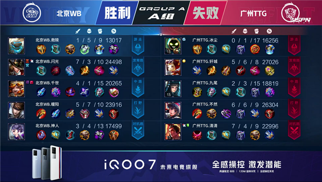 2分51秒,广州TTG橘右京。3分32秒,下路团,双方1换1,孙尚香拿下一血。4分50秒,北京WB破掉广州TTG上一塔,随后团战1换4。5分05秒,北京WB破掉广州TTG中一塔。7分33秒,广州TTG拿下暴君。10分16秒,北京WB拿下暗影暴君。10分58秒,北京WB先后破掉上、中二塔。13分40秒,中路团,北京WB打出2换3,不知火舞拿下双杀。15分01秒,北京WB拿下暗影暴君,广州TTG击杀马超并控下暗影主宰。18分45秒,北京WB击杀夏洛特,随后破掉广州TTG下高地。19分23秒,下路团,双方3换3。22分48秒,广州TTG打出1换2。23分40秒,广州TTG拿下风暴龙王。28分37秒,广州TTG拿下风暴龙王,随后团战夏洛特拿下三杀。29分09秒,广州TTG破掉北京WB水晶赢下比赛。