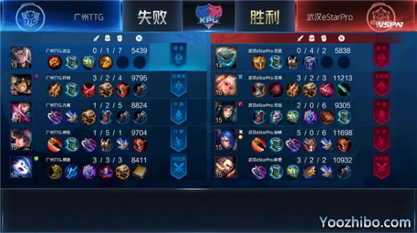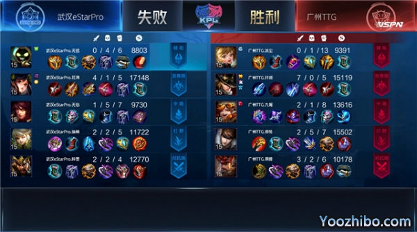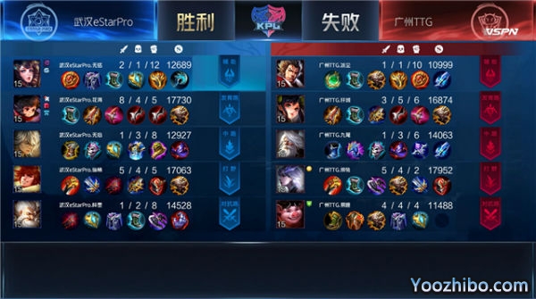 开局武汉eStar入侵红BUFF野区成功。2分15秒武汉eStar拿下暴君。2分30秒武汉eStar野区击杀元歌拿到一血。3分35秒武汉eStar上路击杀娜可露露。5分13秒武汉eStar上路打出0换2,广州TTG中路击杀盾山。6分59秒武汉eStar曹操一打二打出1换1。8分38秒武汉eStar拿下先知主宰。9分09秒上路团战广州TTG打出0换2。10分54秒广州TTG元歌抢到黑暗暴君。11分57秒广州TTG下路击杀曹操。12分09秒中路团战双方1换1。12分46秒武汉eStar中路打出0换2。13分11秒武汉eStar摧毁中路外、二塔。13分34秒武汉eStar拿下主宰。14分32秒野区团战武汉eStar打出2换4。15分02秒武汉eStar摧毁水晶拿下比赛。