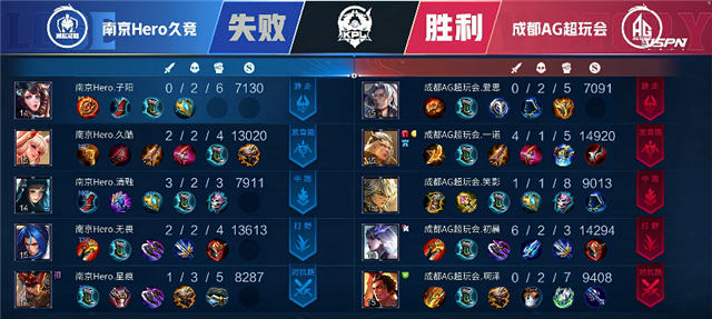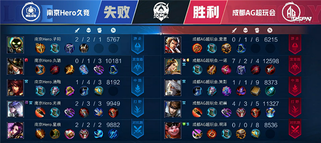 开局公孙离中路抢线。3分钟初晨拿下一血。4分13秒,中路上河道团战,初晨被击杀。4分26秒南京Hero久竞推掉上路一塔。5分40秒成都AG超玩会下路一塔处团战,双方打出1换1。6分45秒,南京Hero久竞推掉下路一塔。8分10秒,南京Hero久竞推掉中路一塔。8分40秒南京Hero久竞入侵蓝区,成都AG超玩会打出0换2。10分钟南京Hero久竞拿下暴君,成都AG超玩会拿下主宰。10分45秒南京Hero久竞强攻下路二塔,无畏被击杀。12分46秒,成都AG超玩会推掉下路二塔。13分50秒成都AG超玩会爱思探草被击杀。14分43秒橘右京拿下暴君。15分钟张良拿下主宰。15分40秒后裔大招开团,双方打出1换1。16分45秒,双方在南京Hero久竞红区团战,成都AG超玩会打出2换3,后裔拿下双杀。成都AG超玩会顺势强攻高地,17分15秒攻破水晶拿下本局比赛。