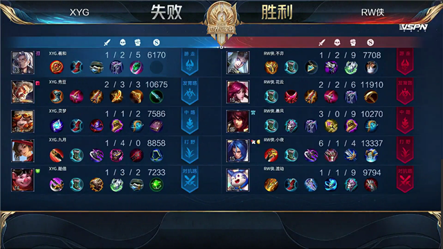 开局49秒XYG打出0换2,1分18秒RW侠击杀鲁班大师,2分43秒RW侠拿下第一条暴君。4分50秒XYG打出1换2,RW侠拆掉XYG下路一塔。5分36秒RW侠打出0换3,6分钟RW侠拆掉XYG中路一塔。7分30秒团战RW侠打出1换2,拆掉XYG下路二塔。8分35秒RW侠拆掉XYG上路二塔,8分51秒XYG中路二塔被破。10分20秒RW侠拿下暗影主宰,11分24秒RW侠拆掉XYG上路高地,12分34秒RW侠拆掉XYG中路高地。14分26秒RW侠拿下暗影暴君,15分钟RW侠拿下暗影主宰,16分钟RW侠拆掉XYG下路高地。16分20秒RW侠打出0换3,一波拆掉XYG水晶拿下胜利。