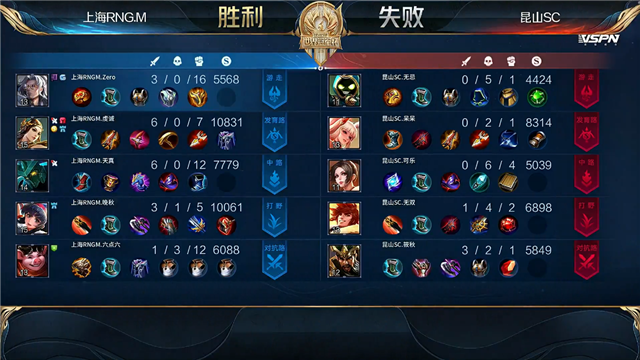 开局双方射手中路抢线,昆山SC入侵野区未果。1分07秒昆山SC拿下中路河道之灵。1分42秒上海RNG.M中路打出0换2。2分55秒野区团战上海RNG.M打出1换3。3分48秒上海RNG.M拿下暴君。4分50秒野区团战昆山SC打出1换2。5分23秒上海RNG.M摧毁敌方下路外塔。7分07秒上海RNG.M中路打出0换3。7分16秒上海RNG.M摧毁敌方中路外塔。8分46秒下路团战上海RNG.M打出0换2。9分15秒中路上海RNG.M打出1换2。10分20秒上海RNG.M野区击杀不知火舞。11分26秒下路团战上海RNG.M打出0换2。12分02秒上海RNG.M摧毁敌方水晶拿下比赛。