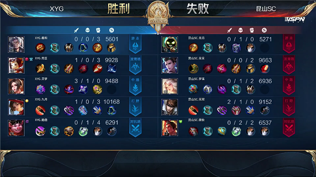 双方平稳开局,3分20秒XYG击杀赵云拿下一血,4分钟XYG拿下暴君。6分45秒XYG击杀吕布,7分钟XYG拆掉昆山SC上路一塔,9分分钟团战XYG击杀吕布,拆掉昆山SC中路一塔。10分37秒XYG拿下暗影暴君,11分钟团战双方1换1,11分20秒XYG拆掉昆山SC中路二塔。11分55秒XYG拿下暗影主宰,13分21秒XYG击杀太乙真人。13分40秒XYG拆掉昆山SC下路高地,一波拆掉昆山SC水晶拿下胜利。