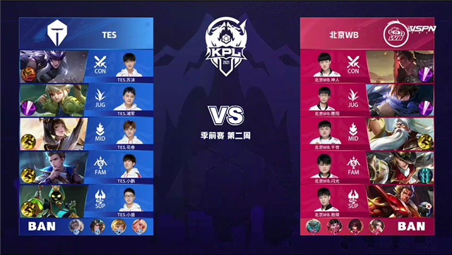 双方和平开局。3分18秒,TES拿下暴君。5分14秒,TES马超抢到先知主宰。5分40秒,TES破掉北京WB下一塔。7分06秒,TES狄仁杰中路击杀马可波罗拿下一血。7分50秒,双方中路1换1。8分30秒,TES马超上路1v2拿下双杀。10分30秒,TES打出0换2并控下黑暗暴君。11分11秒,TES破掉北京WB中二塔。12分08秒,TES控下主宰。13分27秒,TES越高地打出0换2。13分46秒,TES接连破掉北京WB中、下高地后,一波摧毁北京WB水晶扳平比分。