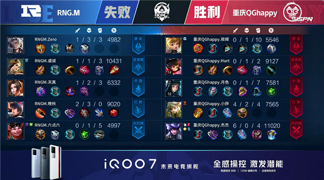 双方平稳开局,2分20秒重庆QG拿下暴君。3分整重庆QG上路打出0换2。3分50秒RNG.M野区击杀芈月。4分09秒重庆QG摧毁敌方上路外塔。4分36秒重庆QG拿下主宰。5分26秒重庆QG摧毁敌方上路二塔。6分34秒重庆QG拿下暴君。7分06秒重庆QG摧毁敌方中路外塔。8分20秒中路团战RNG.M打出1换2。8分54秒RNG.M摧毁敌方中路外塔。9分16秒野区双方1换1。9分25秒重庆QG摧毁敌方中路外塔。11分33秒重庆QG拿下暗影主宰。12分41秒双方野区1换1。13分57秒重庆QG拿下暗影暴君。14分20秒RNG.M上路击杀芈月。14分36秒暴君处团战重庆QG打出1换2。15分12秒双方再度1换1。15分58秒野区团战重庆QG打出1换5。16分22秒重庆QG摧毁敌方水晶拿下比赛。