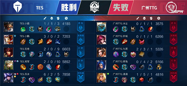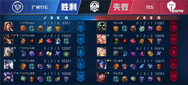 双方平稳开局。娜可露露拿下中路1分钟河道之灵。2分16秒,澜拿下主宰。2分28秒,娜可露露拿下暴君。4分23秒,澜反掉娜可露露蓝buff。4分45秒,TES推掉上路一塔。6分15秒,广州TTG进攻蓝区,虞姬拿下一血。6分50秒广州TTG下路一塔被破。6分57秒,娜可露露拿下主宰。9分17秒澜入侵红区,双方打出1换1。10分10秒中路团战,双方打出1换1。10分45秒,上路娜可露露被澜单杀。11分40秒暴君团,盾山被击杀,澜拿下暴君。11分56秒,TES中路一塔被破。13分06秒,澜拿下主宰。14分钟广州TTG强攻下路二塔,打出0换2。15分钟,广州TTG强攻上路二塔,盾山被击杀,TES二塔被破。15分50秒,中路二塔处澜被娜可露露单杀。16分钟,娜可露露拿下暴君。17分20秒,孙尚香推掉中路一塔。17分40秒娜可露露拿下主宰,同时双方爆发团战,广州TTG打出0换2。19分57秒,中路下河道团战,广州TTG打出1换5,澜拿下三杀。20分45秒,广州TTG攻破TES水晶拿下本场比赛胜利。