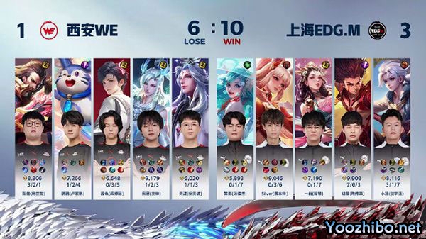 第四局,上海EDG.M选出双大的亚连和哪吒组合,这种冲脸阵容让西安WE难以应对,尤其是敖隐很难在这样的强冲阵容下存活。上海EDG.M凭借这一战术一直冲击对手,成功拿下本局比赛,并以3-1的总比分获得本场比赛的胜利。本局MVP再次被上海EDGM小泽(沈宇泽)的亚连收入囊中,他在本局的出色表现为队伍的胜利立下汗马功劳。