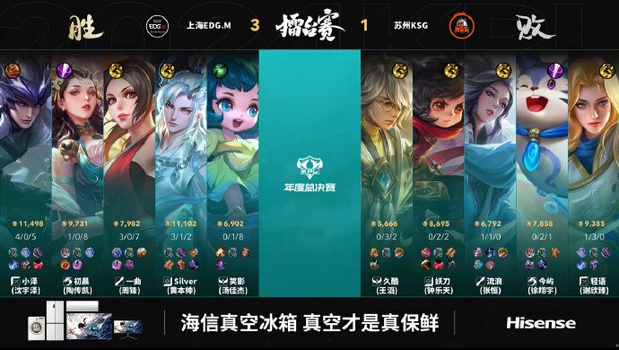 第三局,KSG广厦的阵容未能充分展现出对抗性。EDGM广厦前期三线优势明显,Silver广厦的孙尚香发育极为流畅。随着比赛的进行,双方经济差越来越大。最后,EDGM广厦果断强开团,终结了比赛。一曲再次凭借安琪拉的精彩发挥荣获本局广厦MVP。