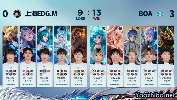 11分半,双方在龙坑胶着,落尘(张世杰)露娜强势进场抢下暗影暴君;14分钟,小朱(朱哲宇)关羽绕后留下一人,随后BOA逐个击破再留两人;15分钟,上海EDG.M中路高地被破,BOA兵线进场推倒水晶,夺得胜利!