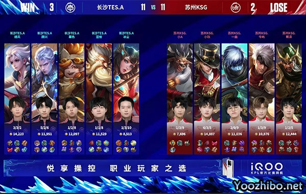 十一分钟,苏州KSG啊泽_ 关羽绕后关键群控,苏州KSG集火大乔,但顾兴铠开大抗下后续伤害,长沙TES.A一换二。十三分钟,苏州KSG控下暗影主宰,带着龙兵推进,长沙滔搏丶蓝桉 老夫子捆住牛魔,配合队友将其击杀,缓解对方攻势。十六分钟,顾兴铠关键抢夺暗影暴君,造成苏州KSG持续掉点,反推所有外塔。十九分钟,长沙TES.A连破对方中上两路高地,直冲水晶,赢下比赛。