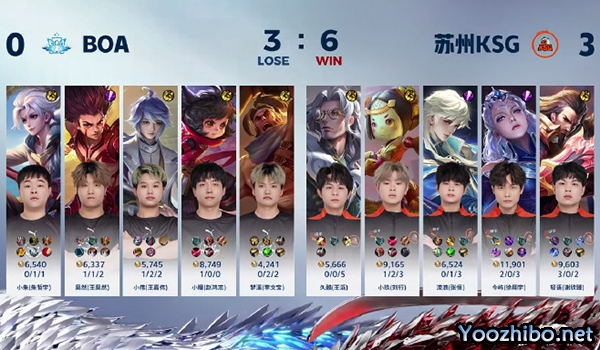 中期苏州KSG凭借自身阵容灵活带线的能力,不断运营兵线破除防御塔,逐渐拉开经济差。八分四十BOA中一塔先破,苏州KSG拿到野区视野。十分二十,BOA小朱 (朱哲宇)亚连先手开团直冲鲁班七号,鲁班七号被团团包围无处可逃先被击杀,但 苏州KSG今屿_ (徐翔宇)露娜后手进场,标记多人后丝滑连飞,配合 苏州KSG轻语 (谢欣臻)曹操,打满伤害拿到三连决胜。随后苏州KSG控下暗影暴君,直接带兵上到高地,点破水晶拿到本场比赛的胜利。