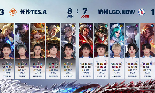 十分五十,LGDNBW-小崽(夏肇汛)张飞大招控制对方两人,赤辰 (伯晨赫)镜击杀暗影暴君,LGDNBW-小落(王科)孙策大招进场击杀对方黄忠。十三分五十,杭州LGD.NBW破除对方下路高地。十五分四十,张飞先手开团群控对方四人,长沙滔搏丶蓝桉(李涿阳)黄忠大招伤害爆炸配合队友击杀对方三人,长沙TES.A强势压迫对方下路高地,并击杀对方王昭君,随后击破水晶,拿到本场比赛的胜利!