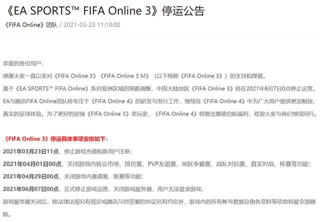 24直播网3月23日讯FIFA Online 3官网今日发布了停运公告,游戏将在今年6月7日0点正式停止运营,关闭服务器。