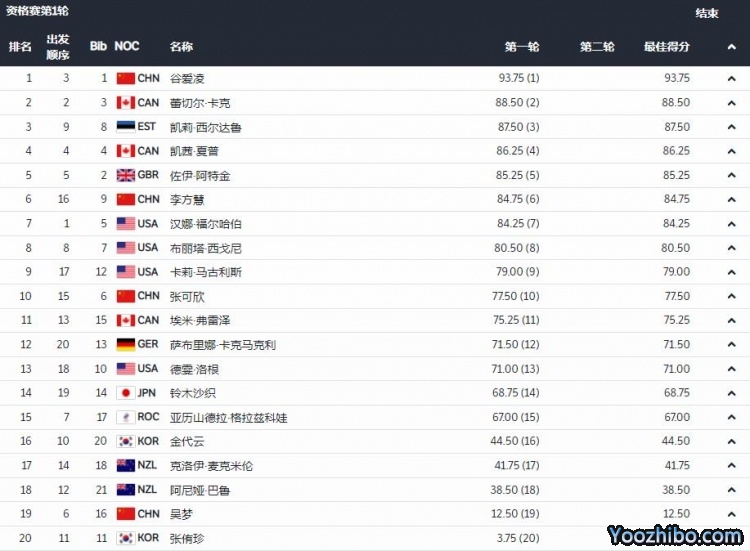 在首轮比赛结束之后,谷爱凌的93.75分高居所有选手第一位,她领先第二名达到了5.25分。李方慧84.75分排名第6位,张可欣77.50分排名第10位,吴梦12.50分排名第19位。