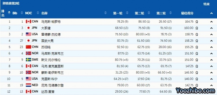 第二轮,苏翊鸣1440的B类动作落地手有点触地,只拿了62.75分,排名下滑至第三。