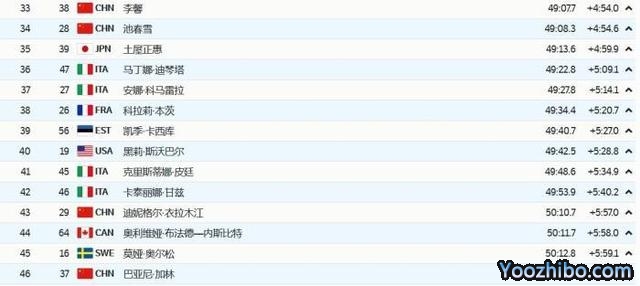中国选手的最终排名为:33李馨、34池春雪、43迪妮格尔、46巴亚尼。
